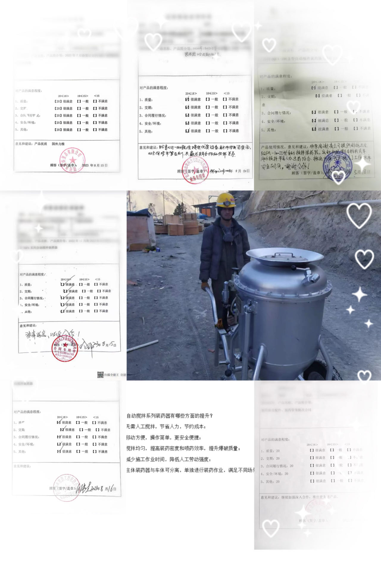 BQFA型自動攪拌系列裝藥器,與人工攪拌相比,無需人工攪拌,節省人力且攪拌均勻,移動方便,操作簡單便捷,大大降低人工勞動強度,提高裝藥密度、爆破質量,減少施工作業時間。先后出口塔吉克斯坦、老撾,秘魯,尼日利亞、法國等國家,使用情況反饋中得到一致好評并大力推薦。
